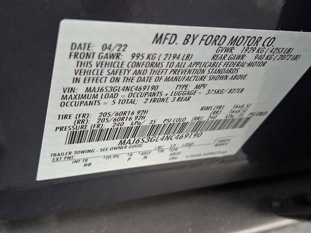 Unique Cloth Heated Front Bucket Seats -inc: 4-way manual driver seat (fore/aft, up/down, w/manual recline and manual lumbar), 4-way manual front-passenger seat (fore/aft, up/down w/manual recline) and manually adjustable head restraints, Trip Computer, Transmission: 6-Speed Automatic w/SelectShift, Transmission w/Driver Selectable Mode, Trailer Wiring Harness, Torsion Beam Rear Suspension w/Coil Springs, Tires: 205/60R16 AS BSW, Tire Mobility Kit, Tailgate/Rear Door Lock Included w/Power Door Locks, SYNC 3 Communications & Entertainment System -inc: enhanced voice recognition, 8" LCD capacitive touchscreen in center stack w/swipe capability, AppLink, 911 Assist, Apple CarPlay and Android Auto capability and 2 smart-charging USB ports.